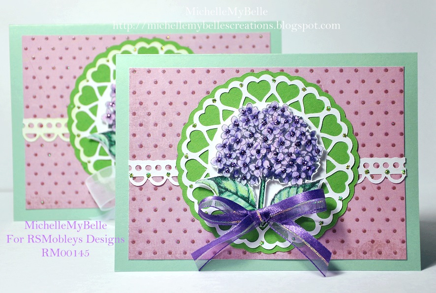 I used Sharon Mobley’s File Fancy Mats 2, RM00148 and Fancy Borders 2, RM00145. This is for a challenge on the VDBC Forum, to use either a digital or hand stamped image and color it by hand. I colored my stamp using the Gamsol and Colored Pencil technique. After coloring my stamp I applied some Stickles to the image, I also hand cut the image and applied Scotch Mounting Tape. Attached the ribbons to my cards using Fiskars Glue Dots. The stamp is a Hero Arts Stamp – Hydrangea. I love this stamp and us it frequently. I also applied some Stickles to the border under the matted stamp, which was cut at 8 inches and trimmed to fit my card.