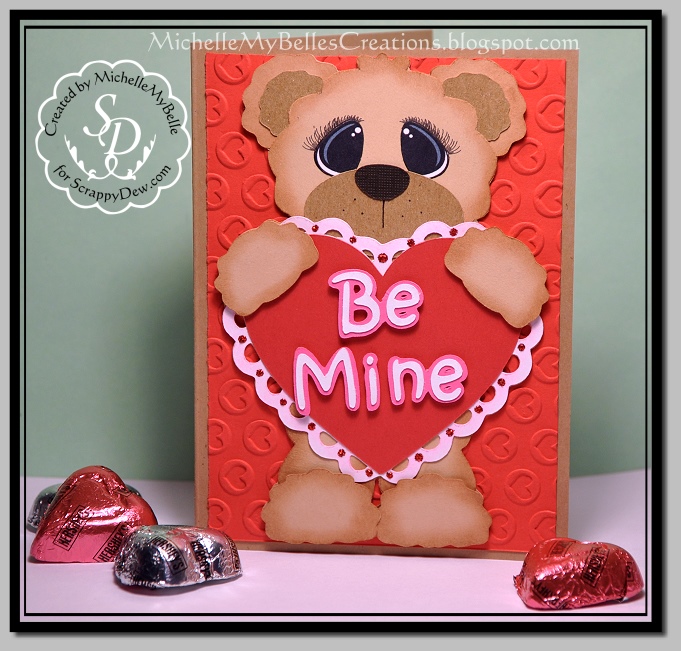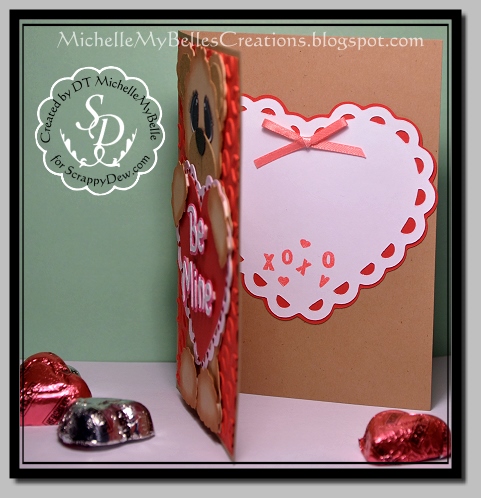 I used some Red X-mas Stickles on the White Lace Heart. I also made a shadow layer for the sentiment Be Mine. I used one of the Sizzix’s Love Set Embossing folders for the red mat on the front of my card.