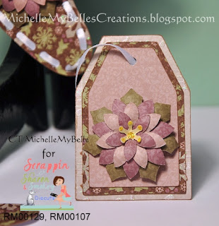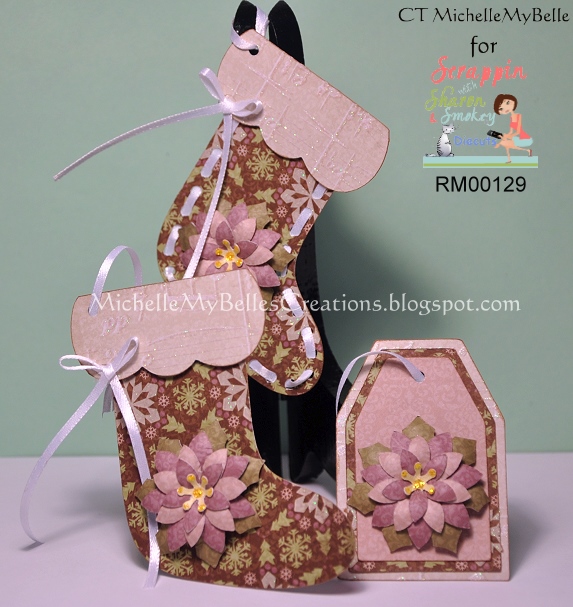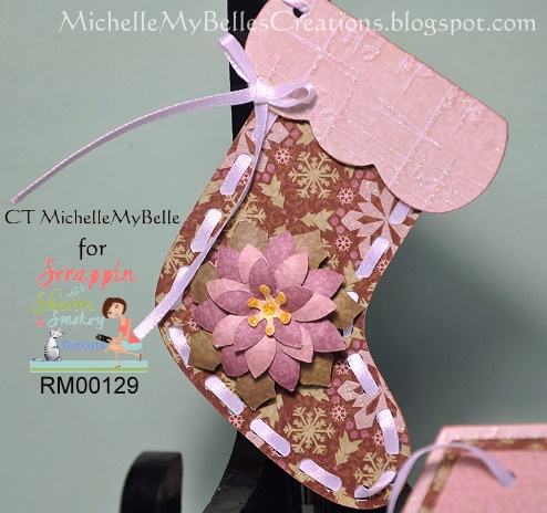 I created this tag set using Sharon’s Lace Up Stocking, RM00129 and her 3D Pointsettia and Tag Set, RM00107.