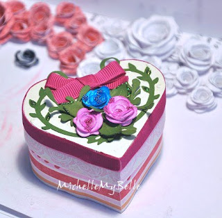 Heart box all made with paper, except for the ribbon LOL. I created the MTC file, made the heart from white card stock and adhered patterned paper, also made the roses and chalked them, added some micro beads.