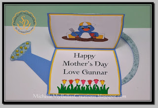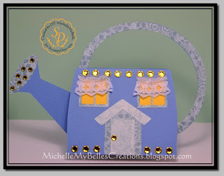 I welded shapes together from within the set to create the top layer card. I then glued the card to the watering can base layer. I added Rhinestones everywhere there was a circle cutout. Some lace for the curtains. Just had a thought, I should have had one of the birds peeking thru the window or door. Darn! LOL Maybe next time.