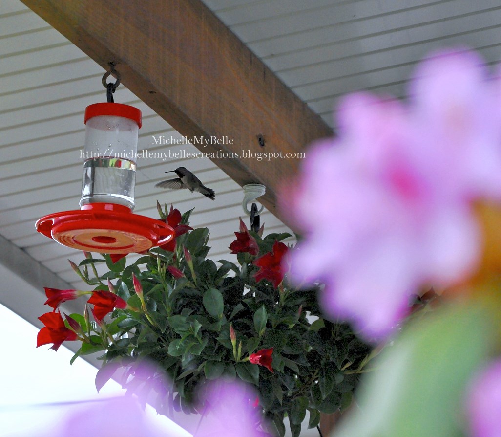 I can sit and watch them for hours! I was out one day trying to photograph a bee on the Rhodo’s and in the corner of my eye I seen it fly past me. Then I heard the squeaking and knew it was a Hummer. I did not have to much time to focus and just picked up the camera quick and took a shot. So glad I was able to get a pic, even though it’s a bad shot.