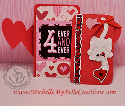 Supplies: ScrappyDew Valentine’s Day Kitty, Red Cardstock, K & Company KP Valentine Paper Stack, Ribbon and Heart Embossing Folder.