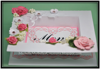 For the inside, I covered the box with pink cardstock and embossed it with a heart embossing folder. The doily mat is made using Martha Stewart’s Punch Around the Page, Vintage Doily. This punch is very pretty, I like the delicate pattern. I also cut a frame to go around the box to hide the box flaps. I’m still not sure what I will add to the Doily just yet.